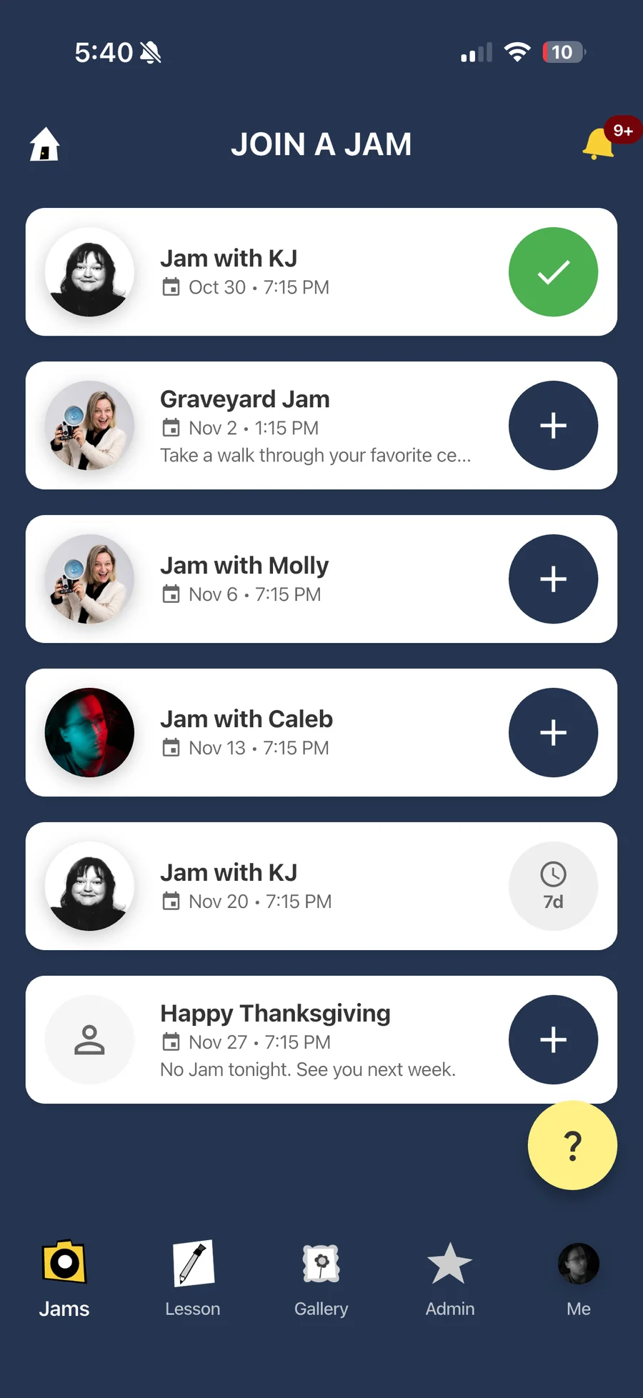 Photo Jam combines structured learning with social engagement: members receive weekly photography lessons, submit photos for community review, comment on each other's work, and join live video "jam sessions" where the group discusses submissions together. The platform fosters genuine connection and skill development through scheduled events, collaborative critique, and a supportive community culture.
