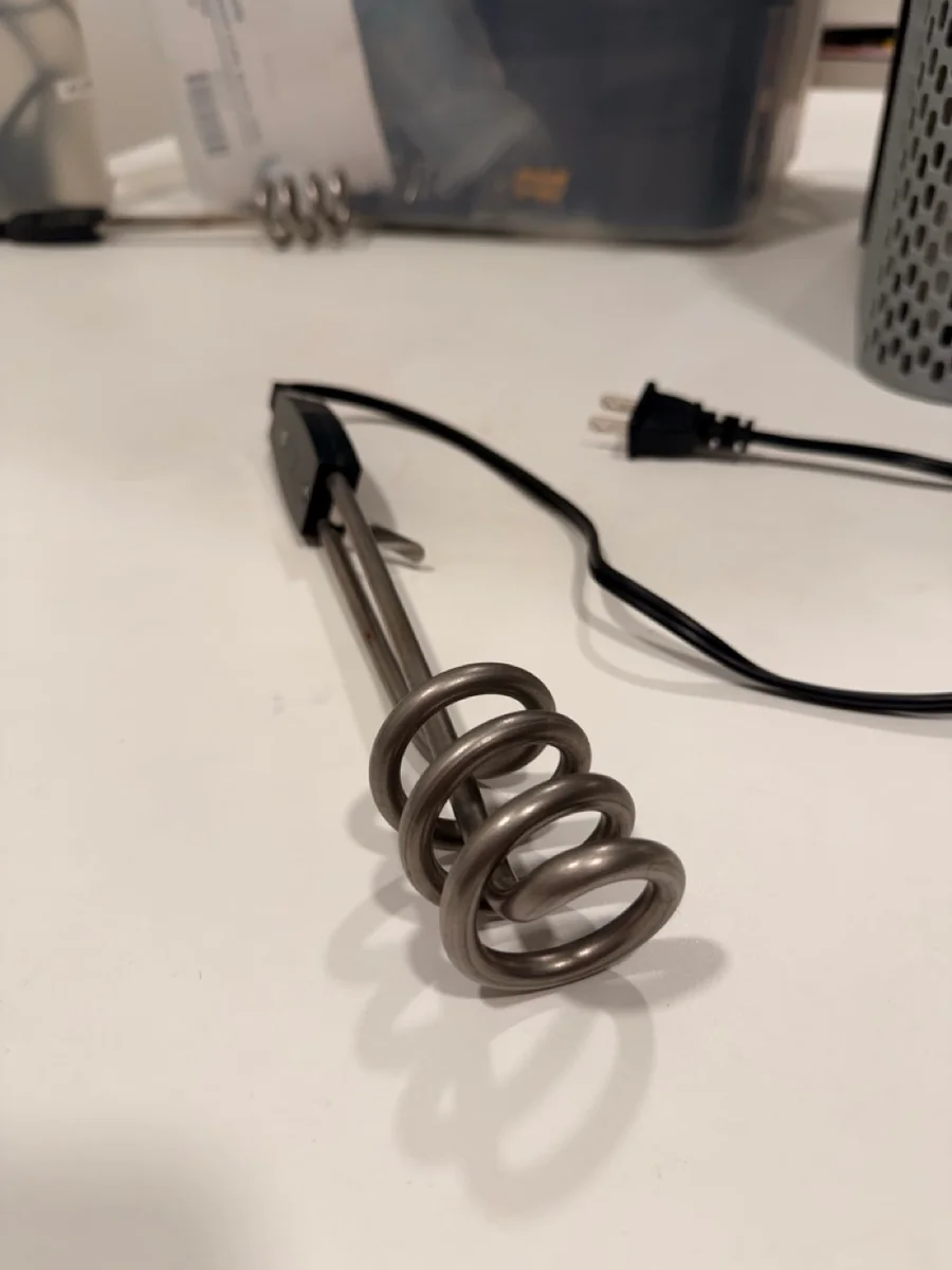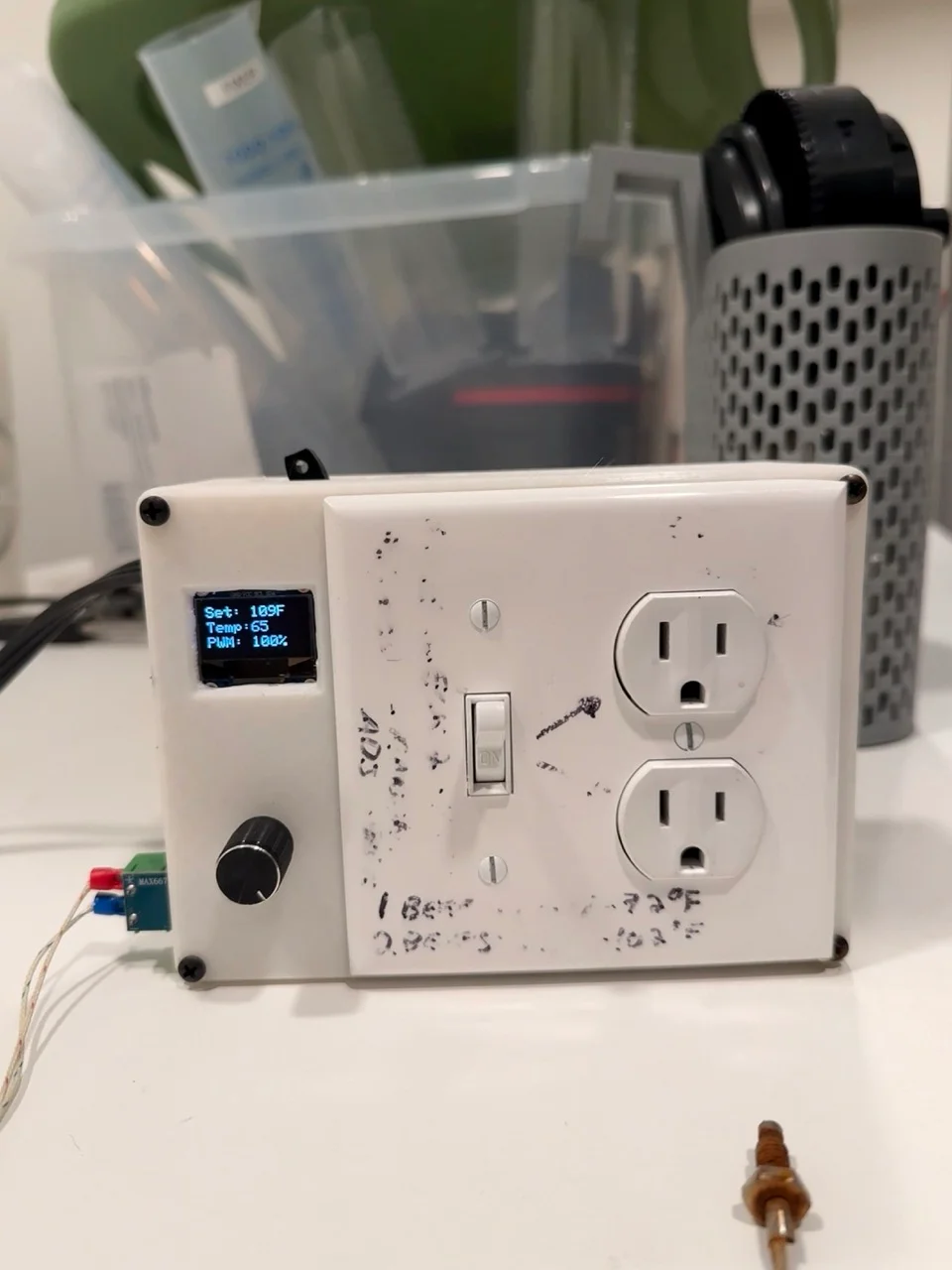 This solution uses an ESP32 microcontroller connected up to a K-type thermocouple to read in the temperature, a solid state relay (SSR) to allow for PID control of the current sent to the 1000W heating coil, and a simple encoder/button and display to control the setpoint and temperature. An aquarium water pump is also powered by the unit to stir the water. I added a light switch to cut power to the heating coil and a breaker is inline with the whole unit.